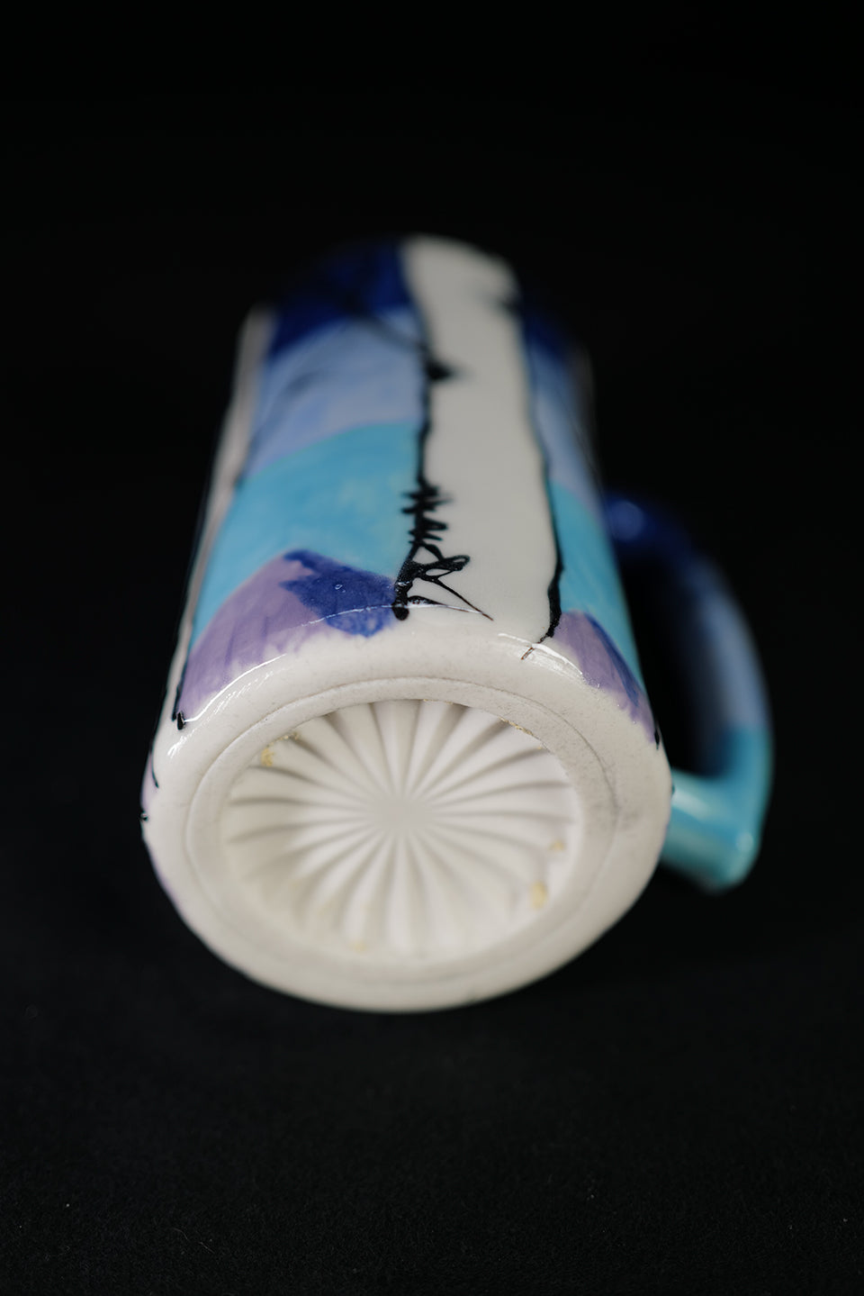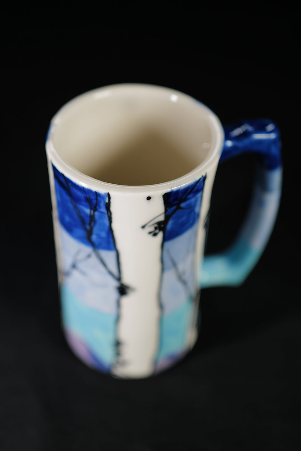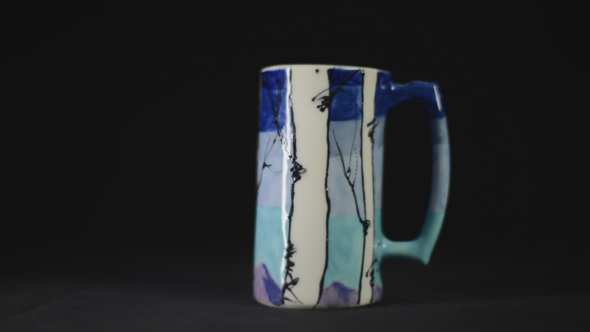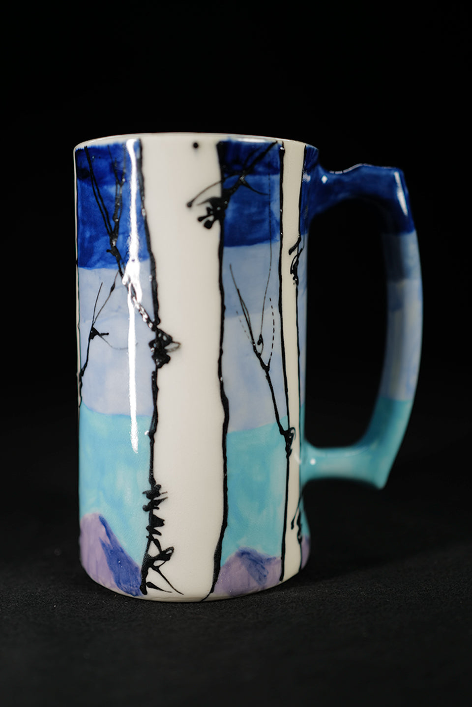 A collaboration with my mother Melissa Roulette who handmade this beer stein in Clark Colorado. In the Spring of 2022 I used underglaze to make 12 unique aspen grove mugs. This is the fourth such collaboration with a similar aspen grove motif. This Beer Stein measures six inches tall and a 3" wide.