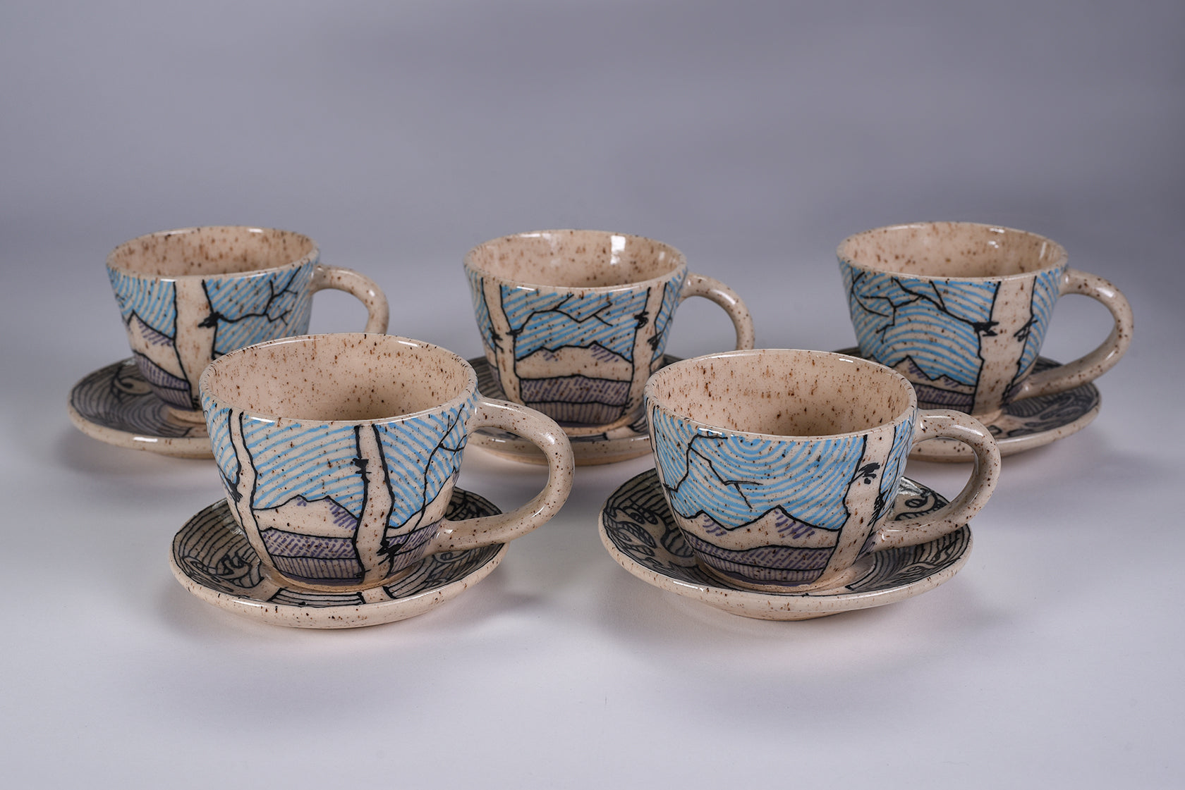 The Latest in the Collaboration between in the Gardens Pottery thrown by Melissa Roulette. A total of 9 Cappuccino sets were made in this run, and all are the exact same size so would make great set!