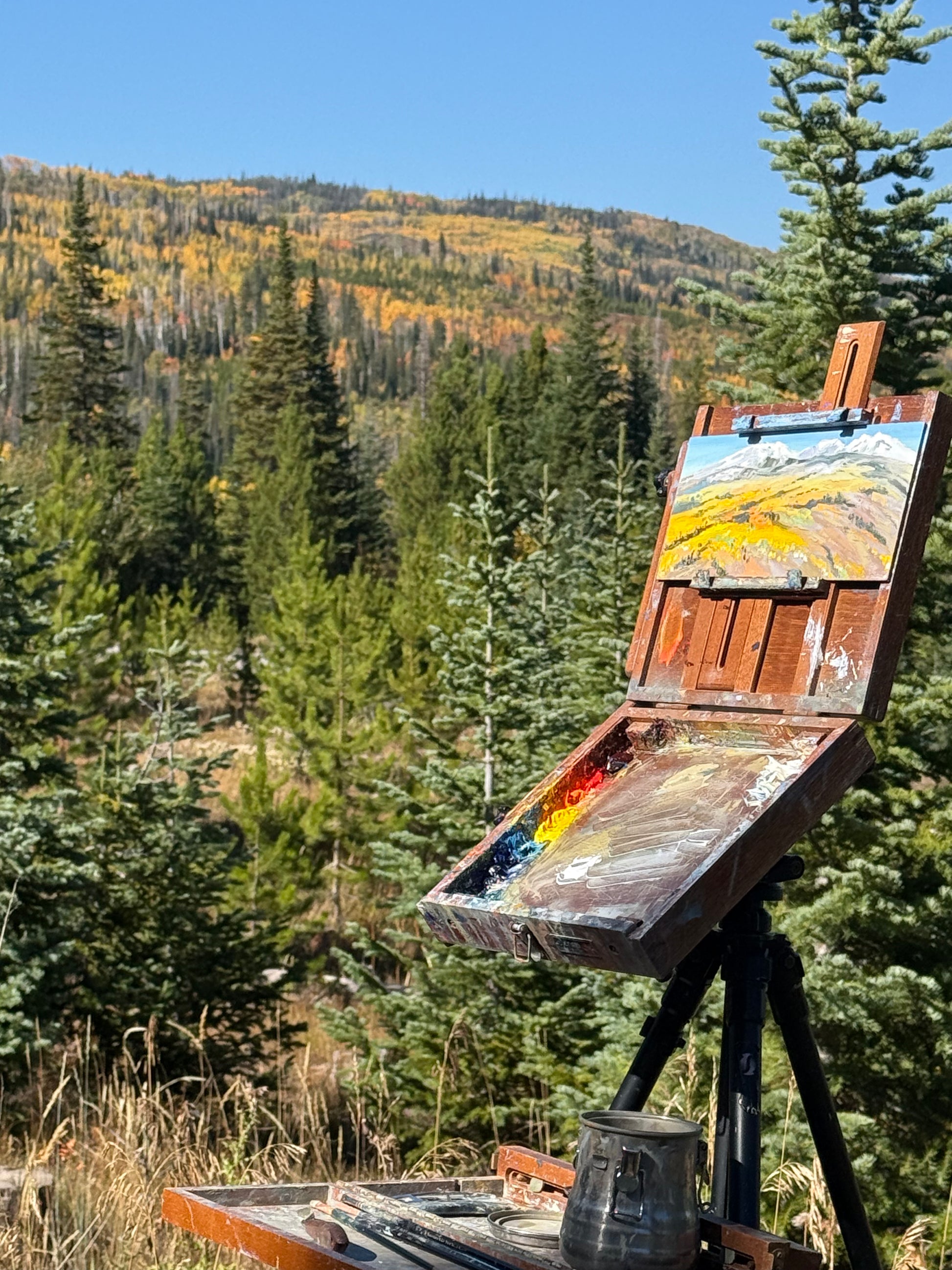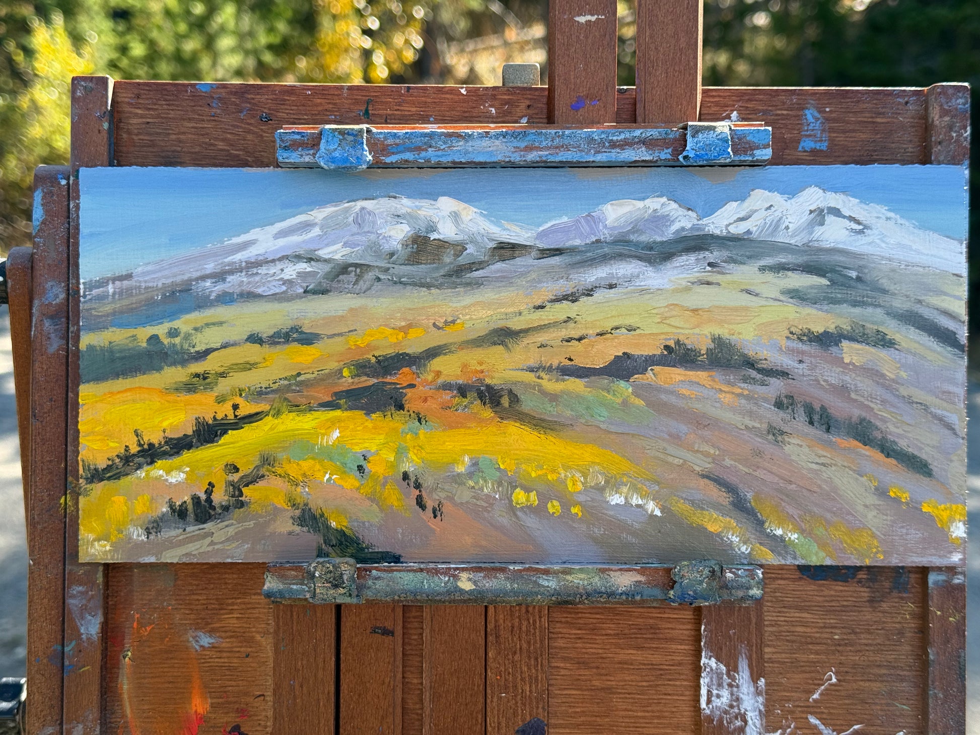 Looking northeast at Mount Agnes after the first snow of the year this Plein Air painting was done on September 24th 2025. Measuring 9 x 11” inches it was done in oil on hardboard. Painted in the Routt National forest outside Clark Colorado.