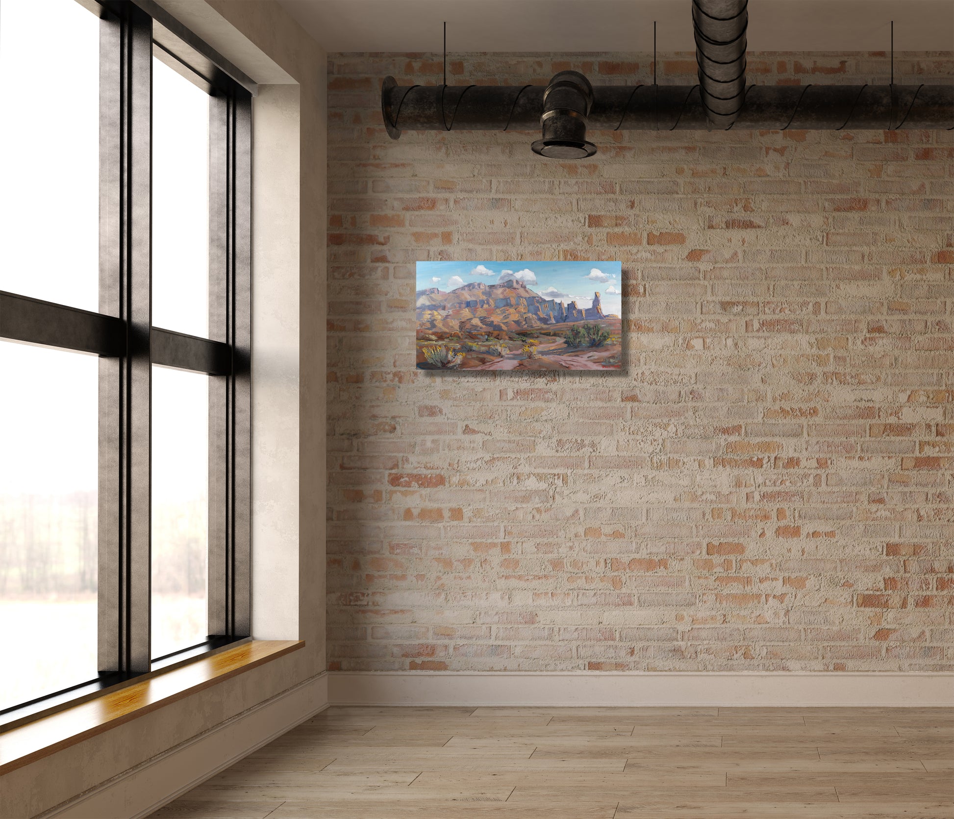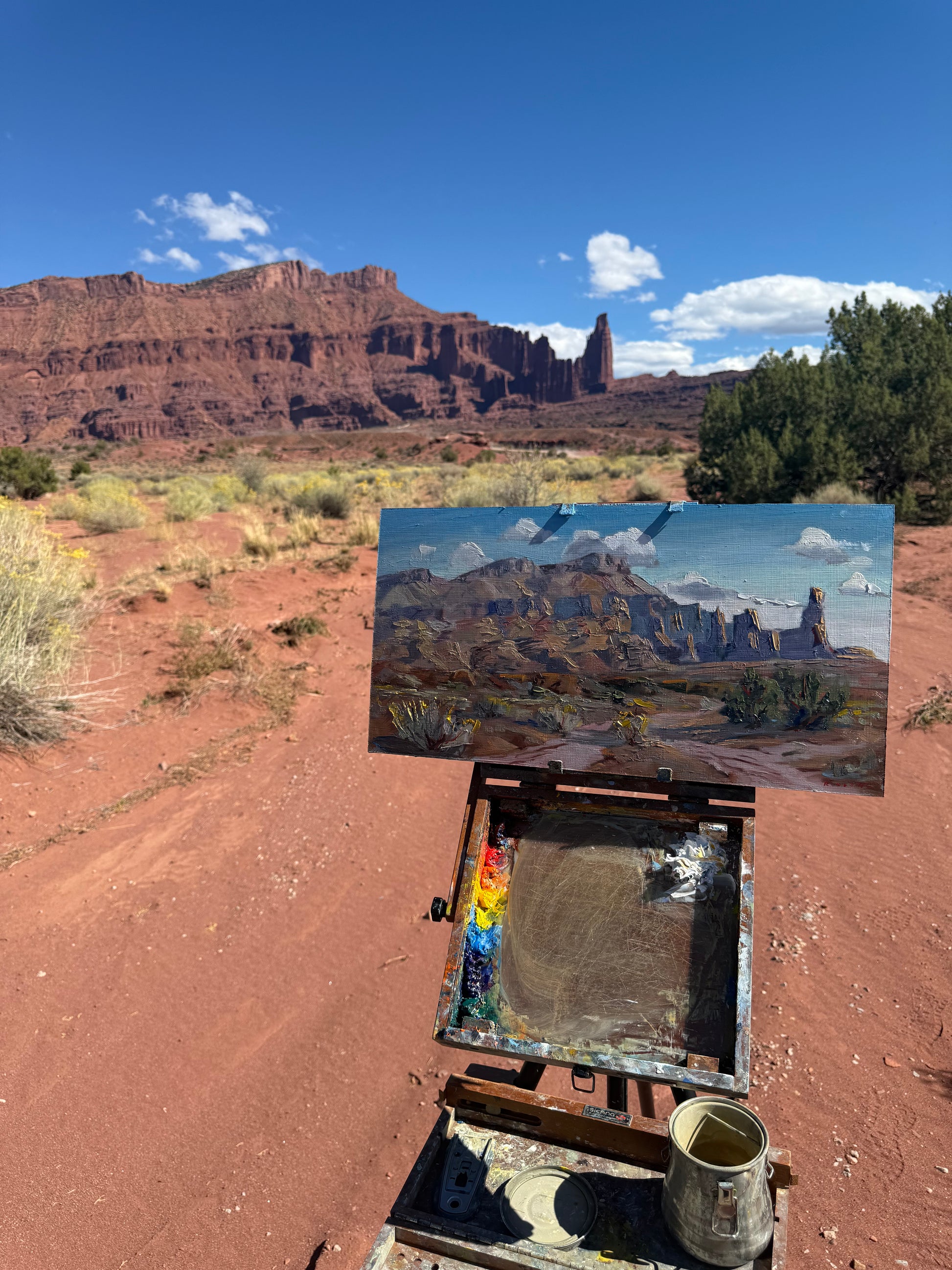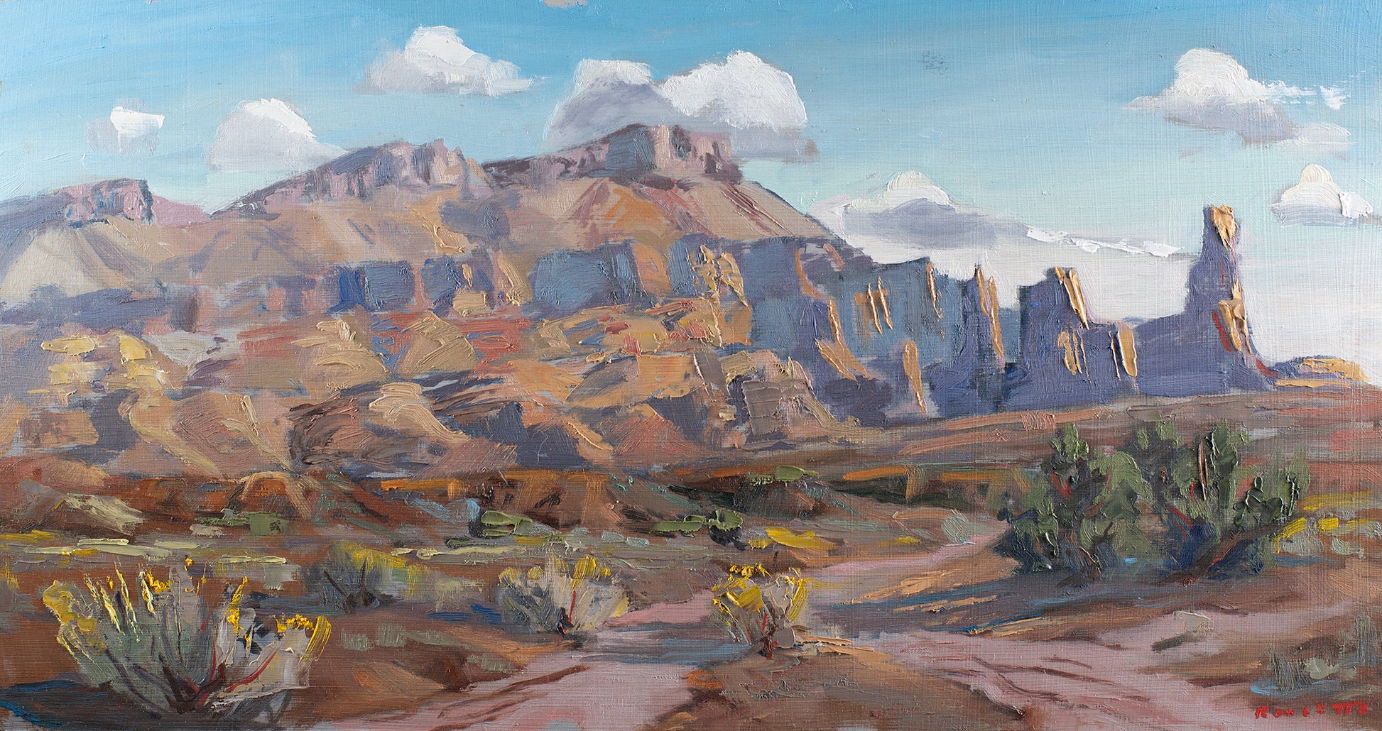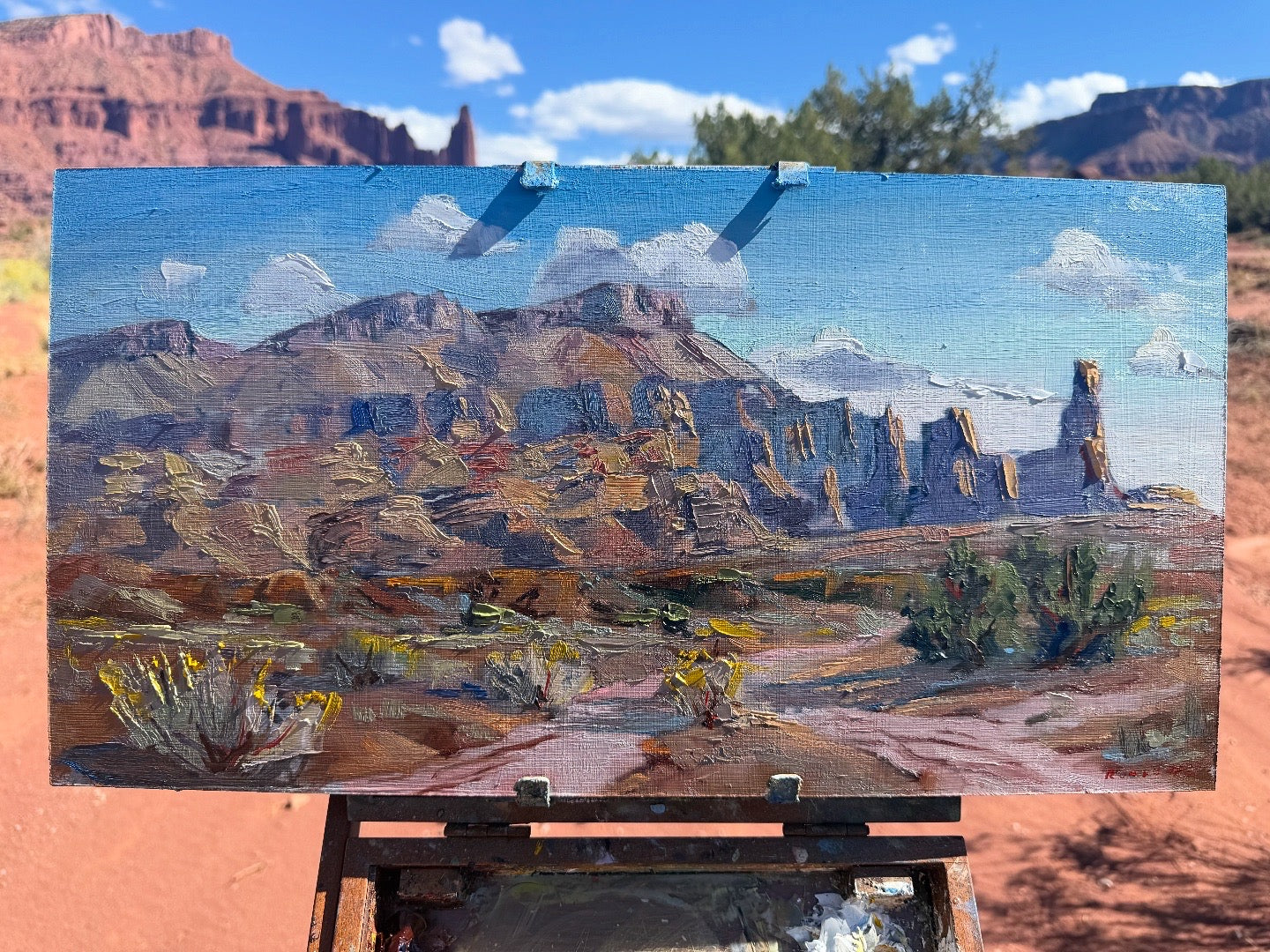 A Plein air painting Measuring 11 x 21”. Painted outside Moab Utah on October 5, 2025 completed an oil on hardboard on a pleasant fall day in Utah.