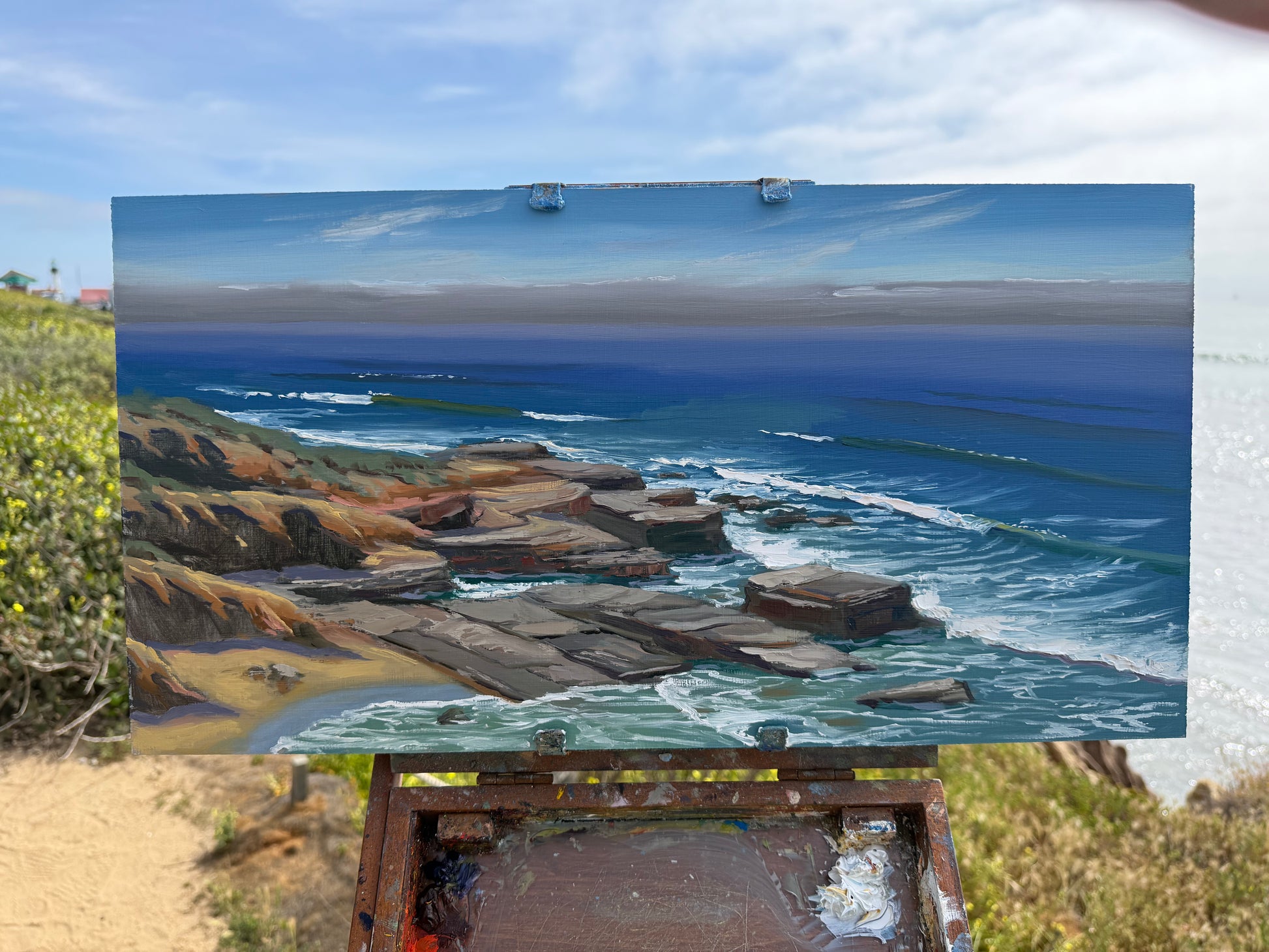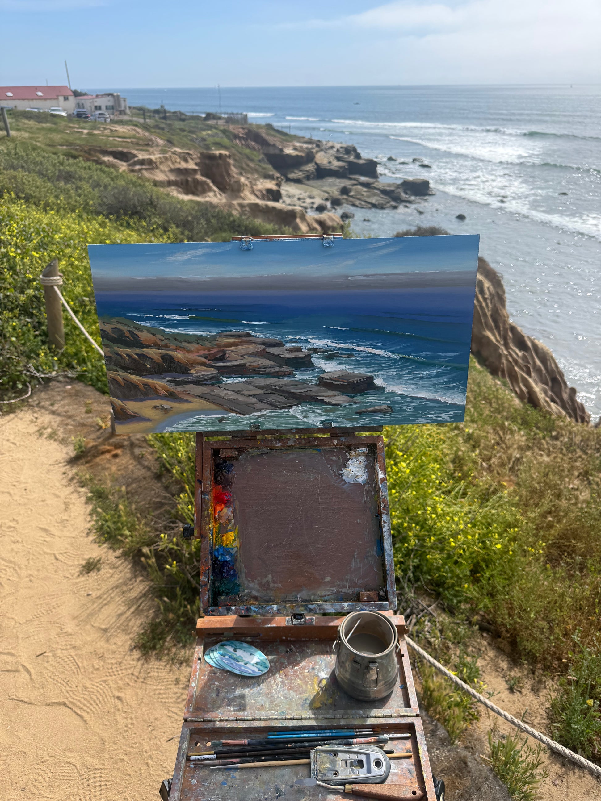 A Plein Air painting competed on March 21st 2026. Measuring 11 x 21” done in oil on hardboard near San Diego California on a warm spring day right before the fog rolled back in.