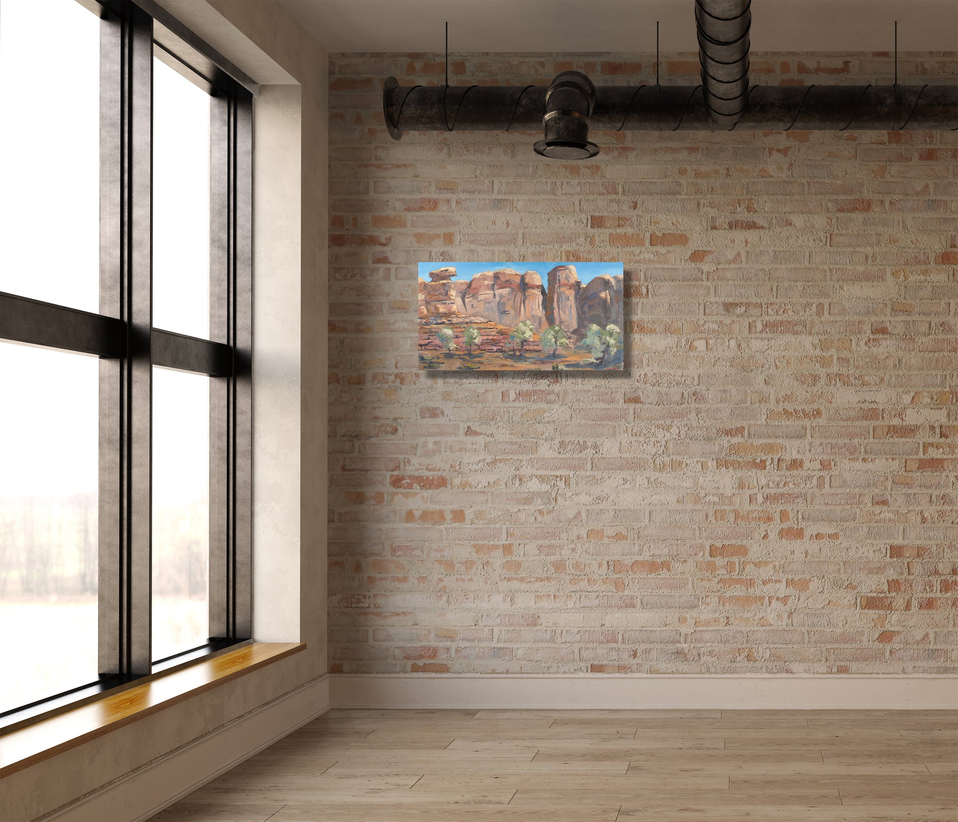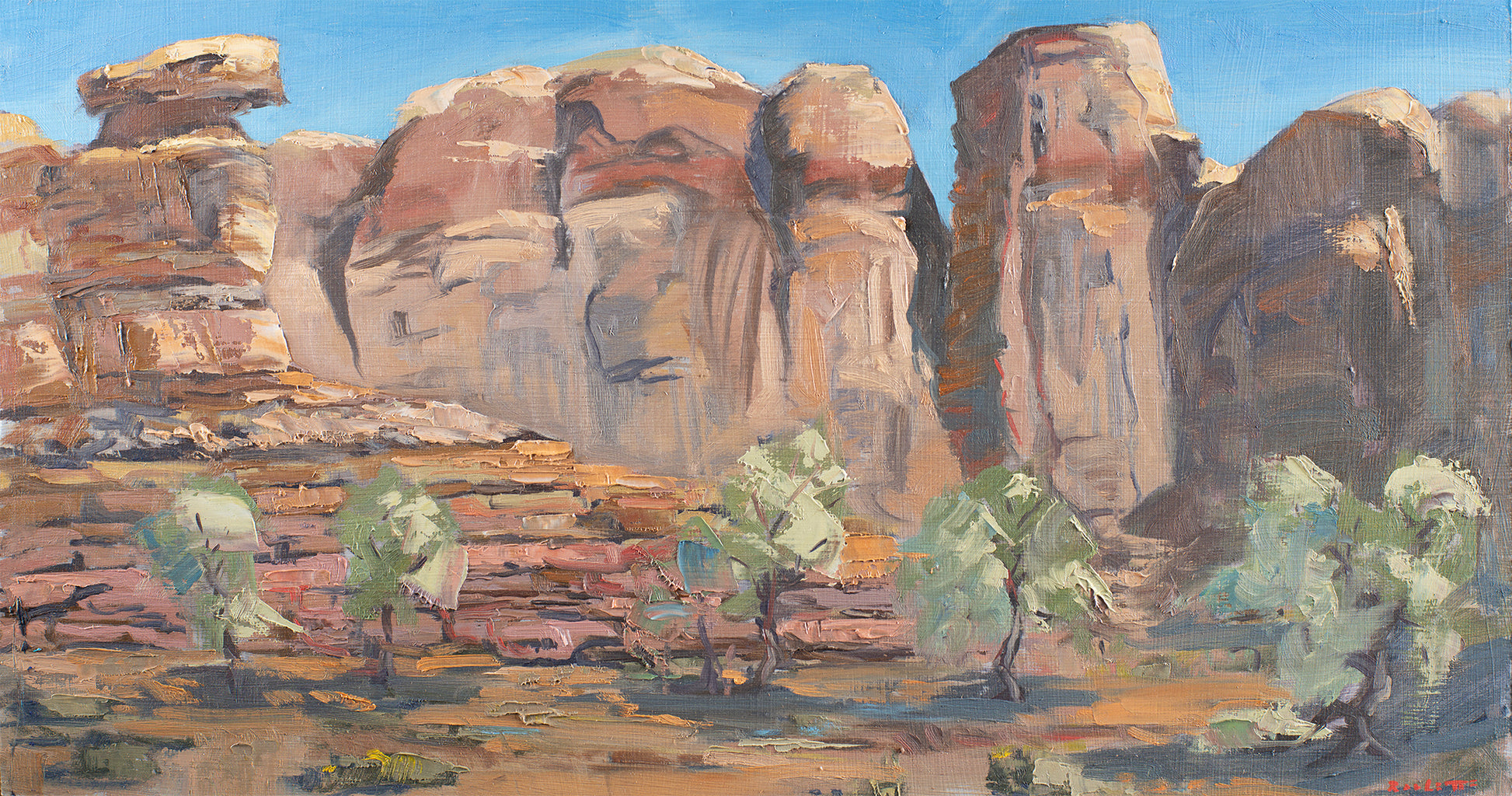 A Plein air painting measuring 11 x 21“. Completed in oil on hardboard on October 6, 2025 painted outside Moab, Utah.