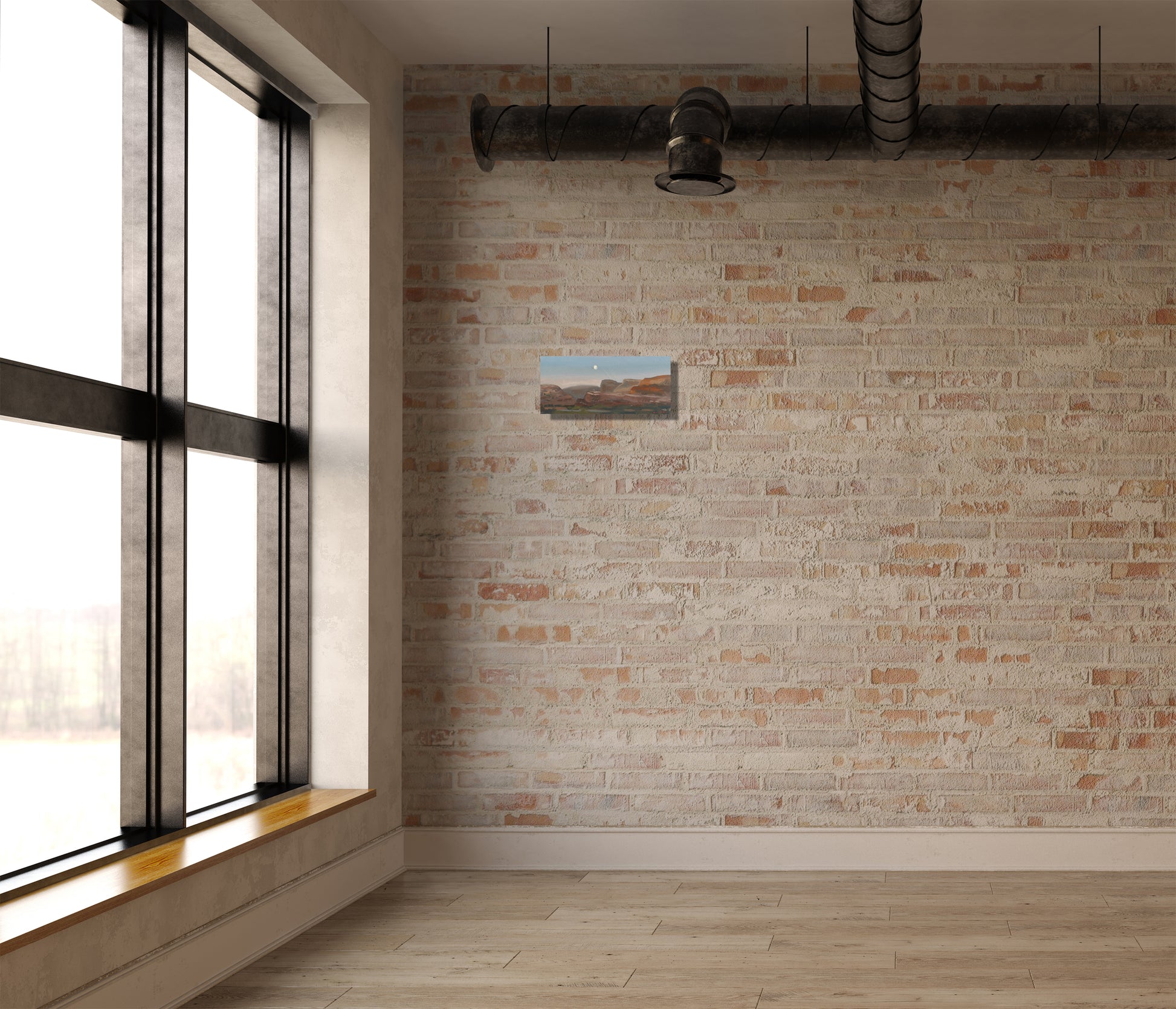 a Plein air painting measuring five by eleven inches. completed in oil on hardboard outside Moab Utah watching the moon rise over the Colorado river in the fall 0f 2025
