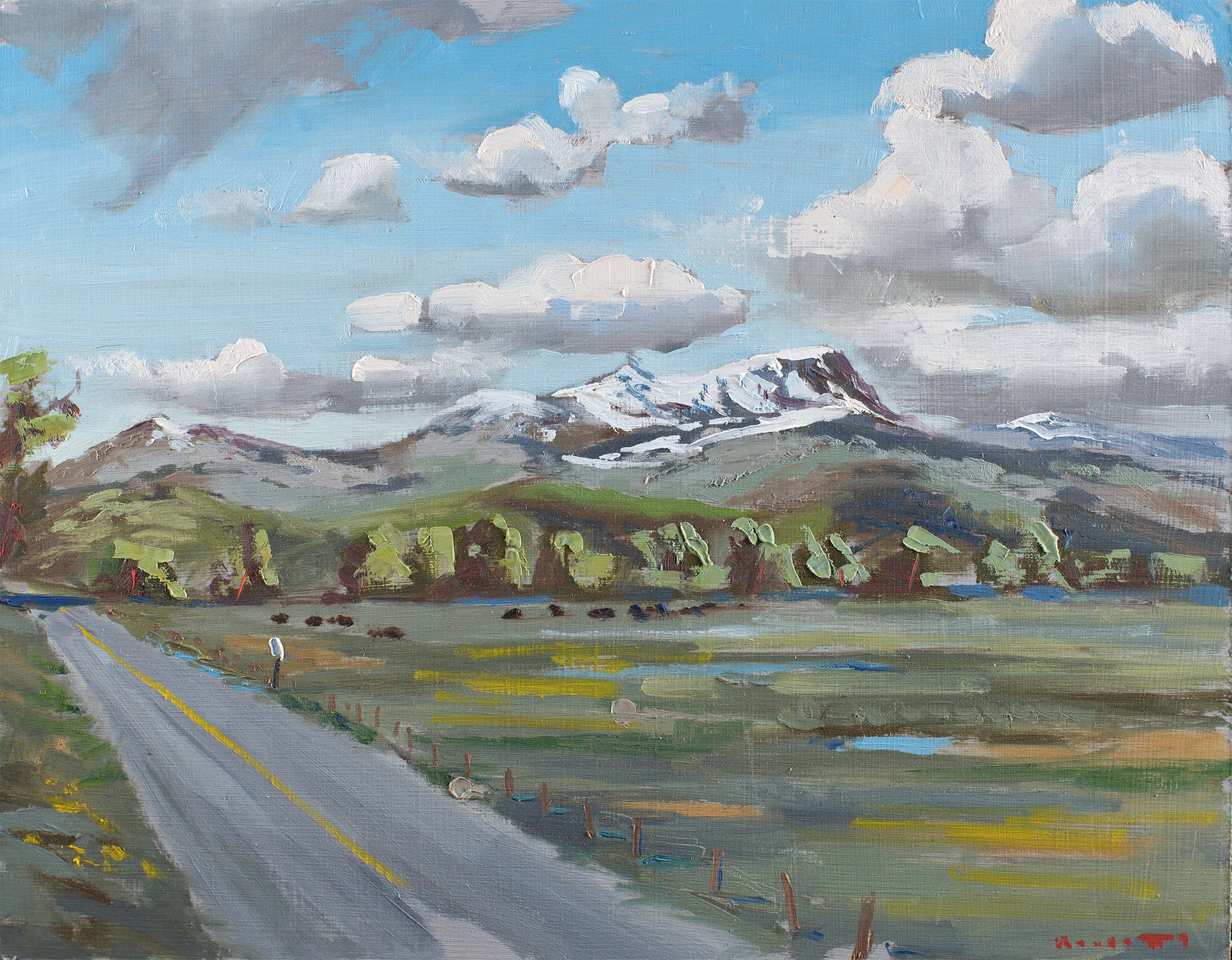A Plein air painting measuring 9” x 12”. Completed in oil on hardboard on May 21’st 2025. Looking West at sound mountain from Downtown Clark Colorado.