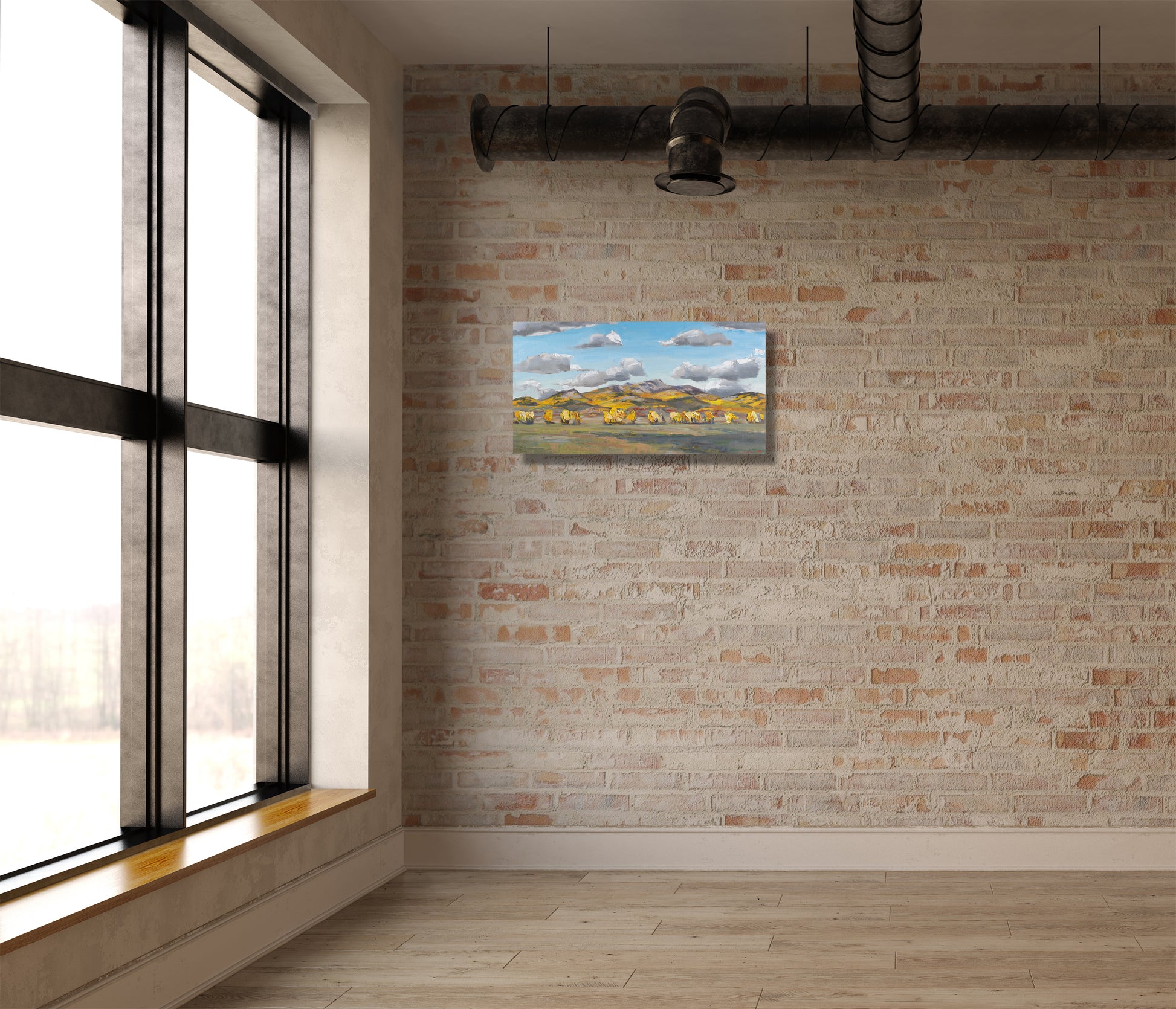 A Plein Air painting measuring 11 x 21” painted in oil on hardboard. Completed on October 1st 2025. Looking west during peak fall at Sand Mountain outside Clark Colorado.