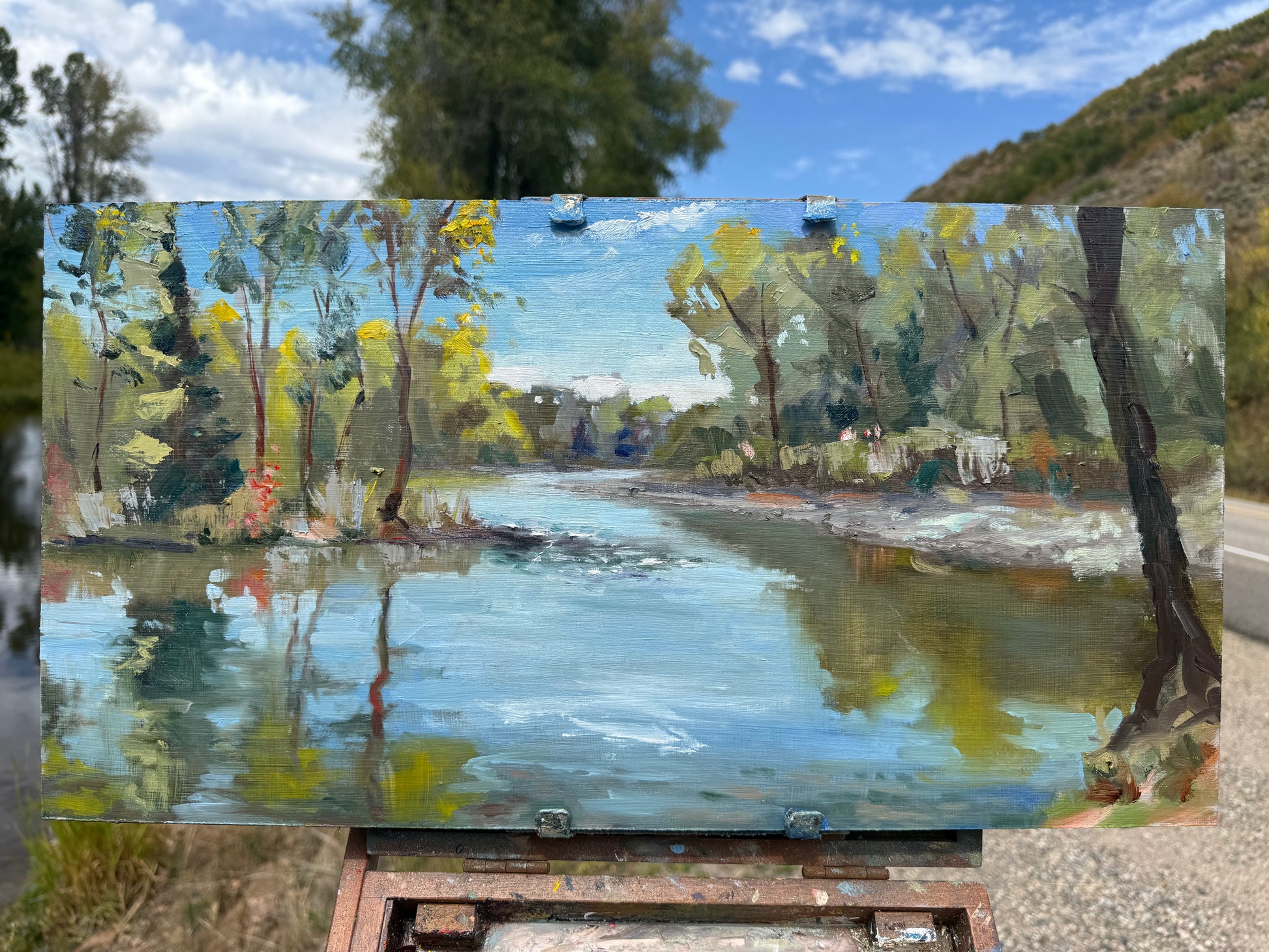 A Plein air painting measuring 11 x 21 inches. Completed on September 16th near Steamboat Springs Colorado. Done in oil on hardboard.