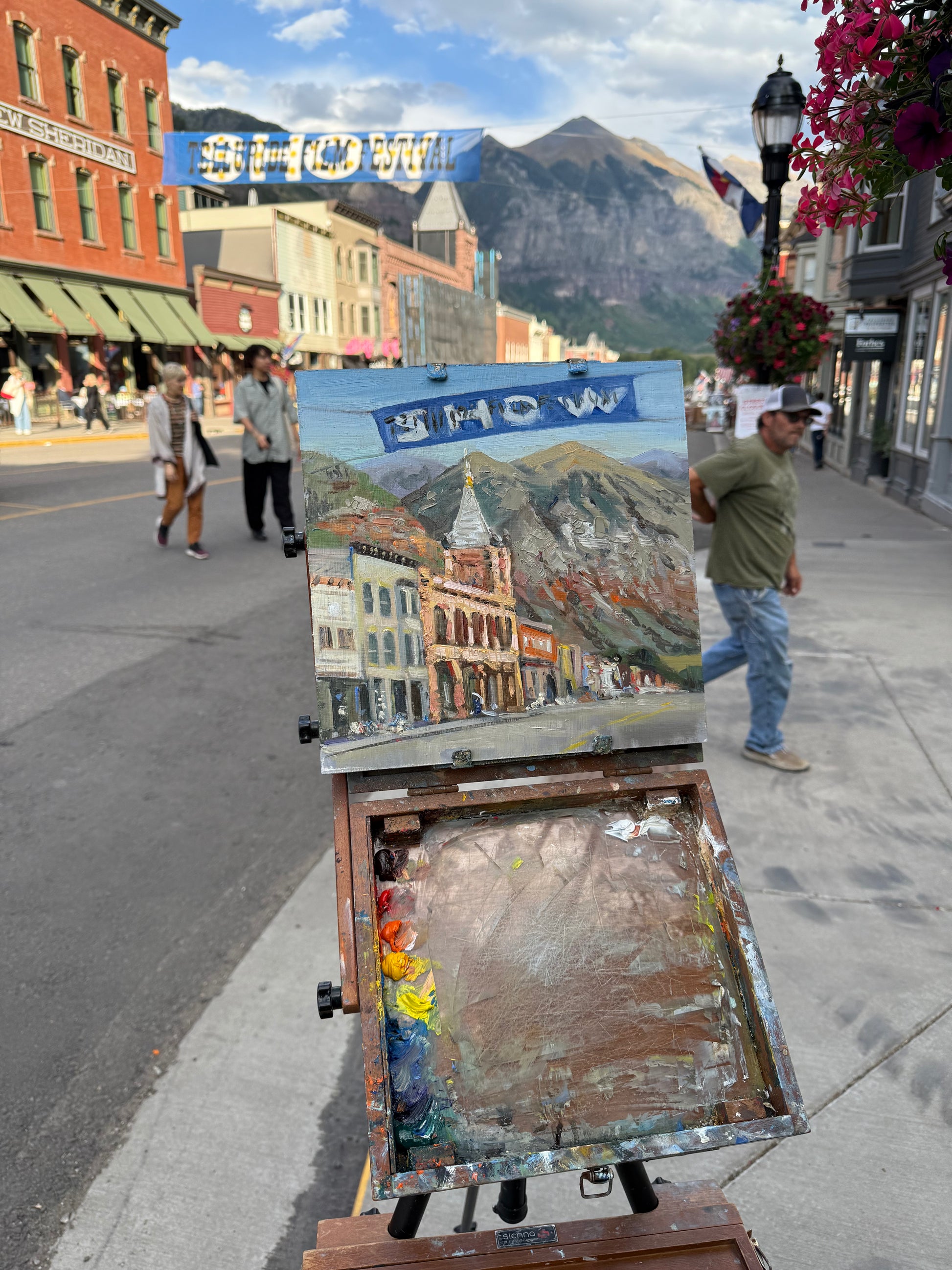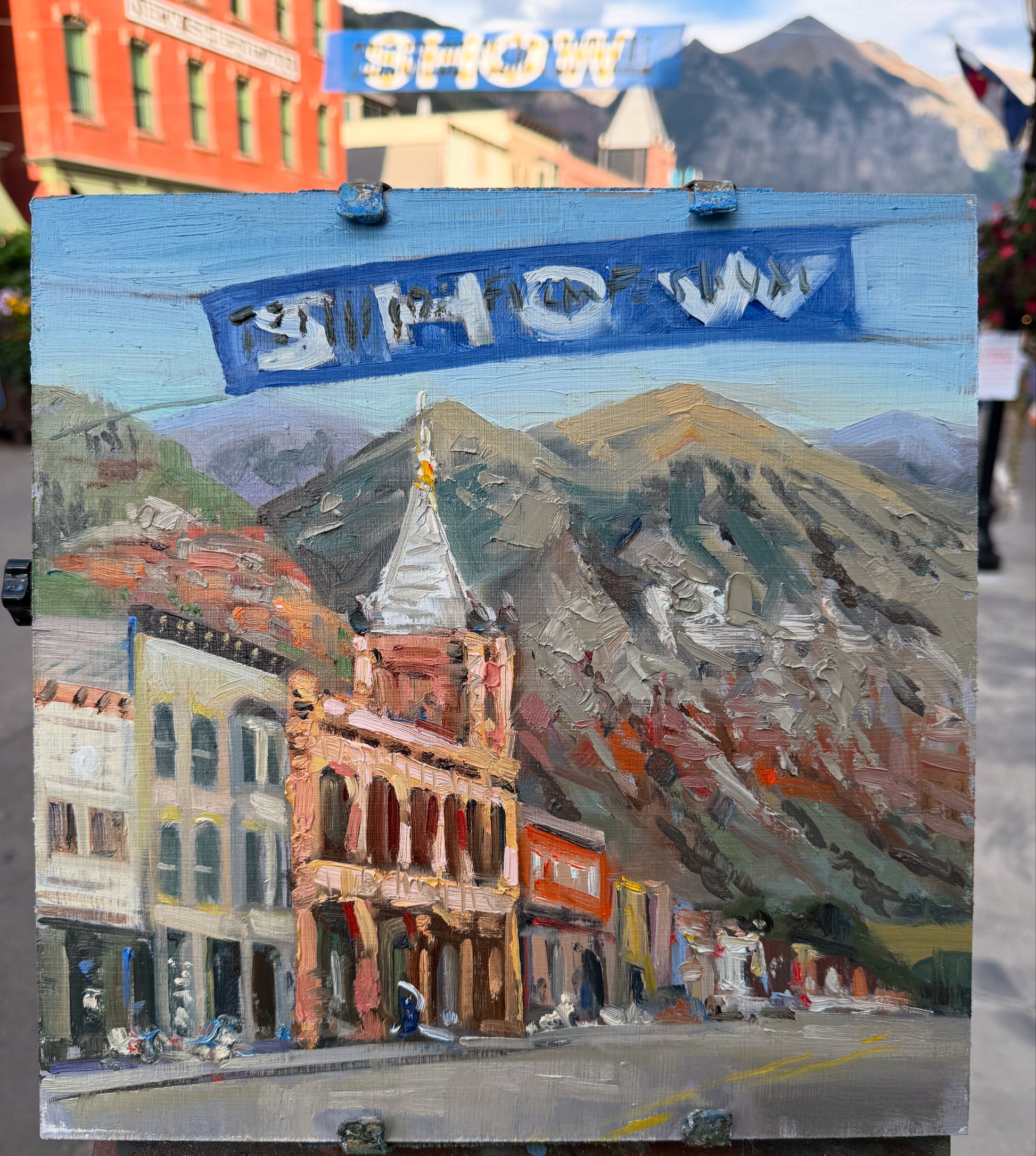 A Plein air painting measuring 12” x 12”. Completed in oil on hardboard. Painted on August 31st in Telluride Colorado during the telluride film fewtival.