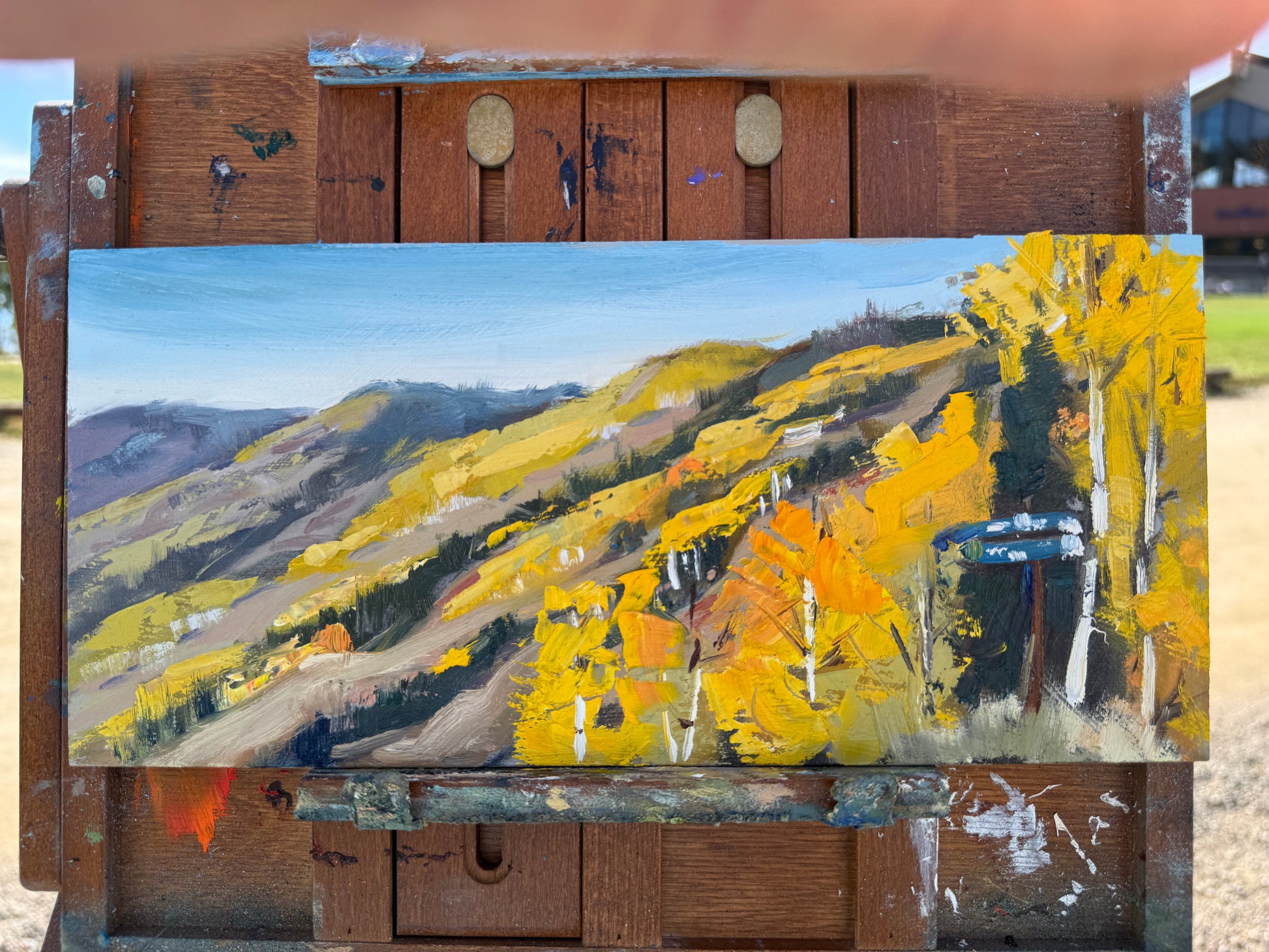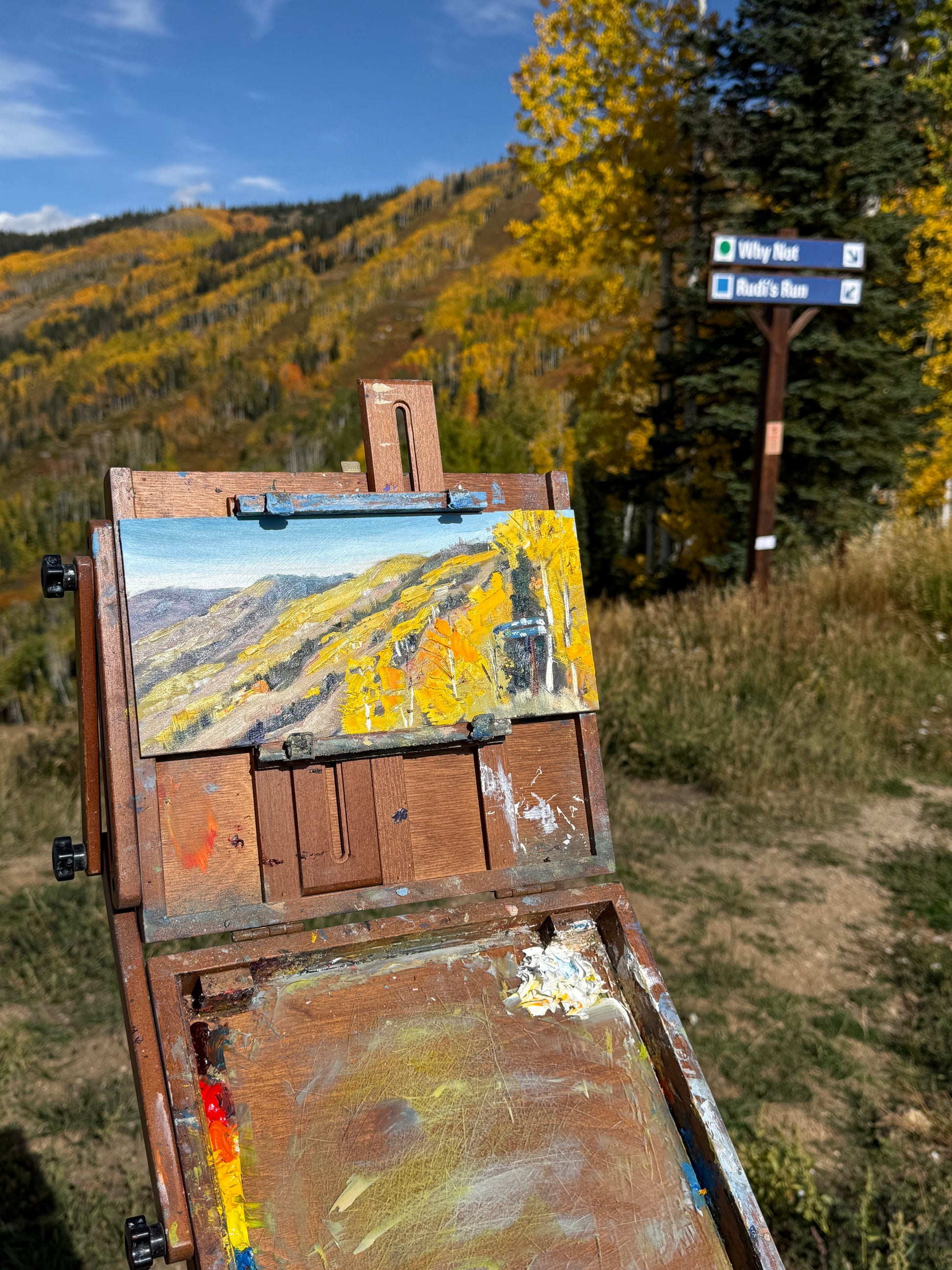 A Plein air painting measuring 9“ x 12“. Painted on September 26, 2025 at the steamboat ski resort. Completed in oil on hardboard.